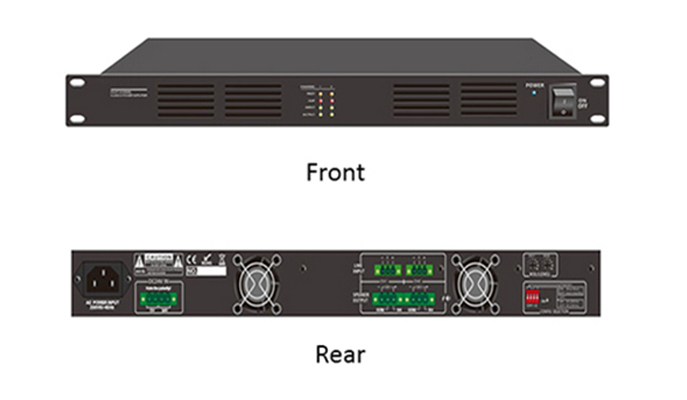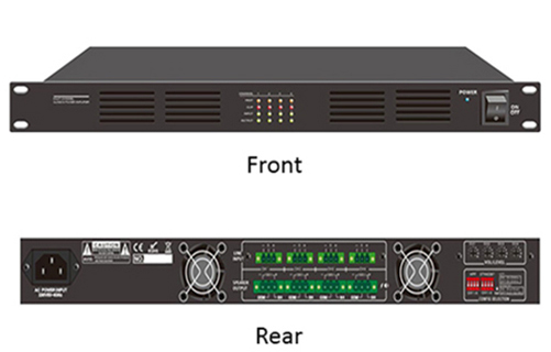 - Rack mount PA 100 Volt four channel power amplifiers in 2U type. • Rated power of 4×120W for four zone public address system. • 70V, 100V and 4-16 ohm four channel separate speaker outputs. • Isolated transformer for human safety operation. • Unbalanced four channel line inputs by RCA type. • Reliable protection of over heat, over load, clip & short circuit. • Indications for power, signal, clip, protection and temp. • DC 24V power supply backup input (optional)