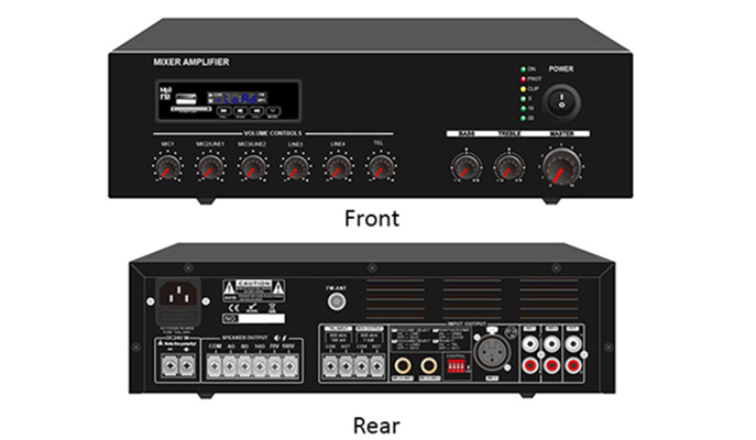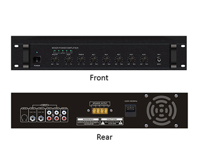 The mixer amplifier rated power out at 240W. Its speaker outputs with 100V, 70V and 4‐16ohms for versatile connections.