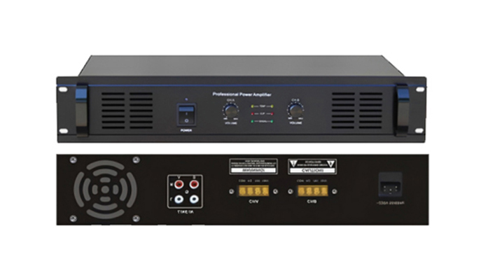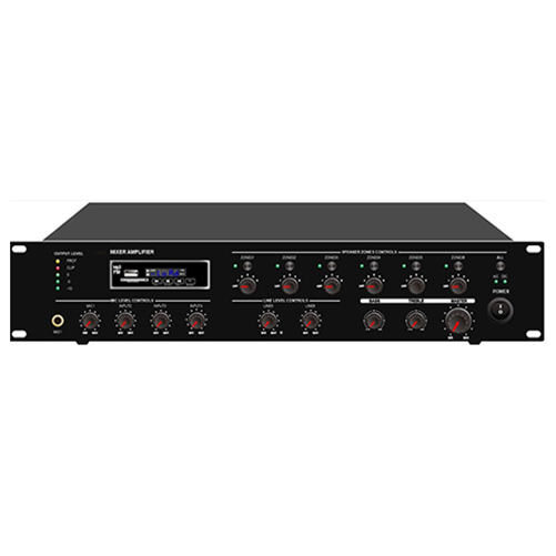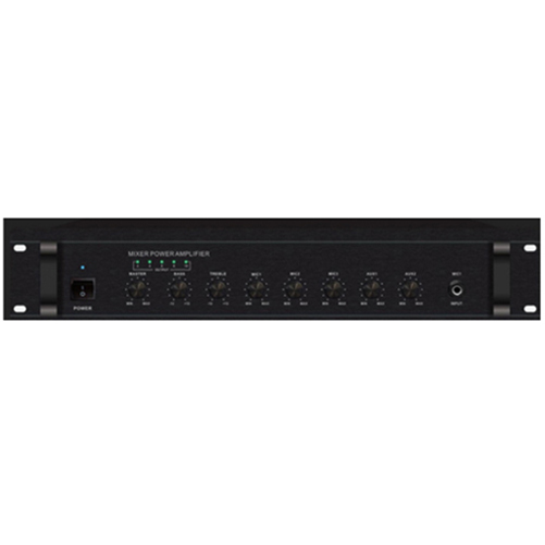 The desktop mixing amplifier has a 60W–500W power output rating. For flexible connections, it has speaker outputs with 100V, 70V, and